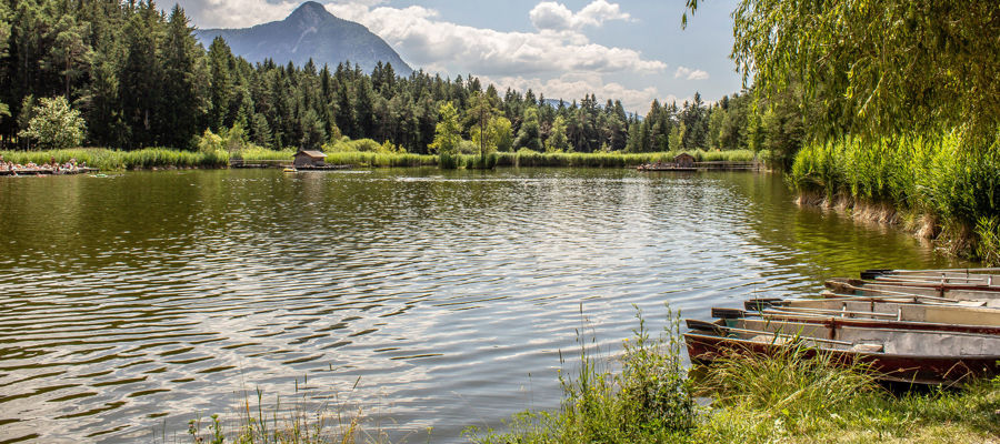D'estate, il laghetto vicino a Fiè allo Sciliar vi invita a nuotare o fare una gita in barca.